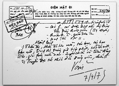 Điện mật số 1574 lúc 9 giờ 30 phút ngày 7-4-1975 của Đại tướng Tổng tư lệnh Võ Nguyên Giáp dưới bí danh “Văn” gửi các đoàn quân đang tiến về giải phóng Sài Gòn trong chiến dịch Hồ Chí Minh: “Thần tốc, thần tốc hơn nữa. Táo bạo, táo bạo hơn nữa”. Chiến dịch Hồ Chí Minh toàn thắng đã kết thúc thắng lợi cuộc kháng chiến chống Mỹ, giải phóng hoàn toàn miền Nam, thống nhất đất nước.