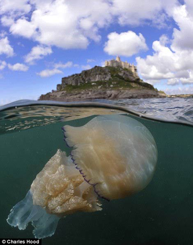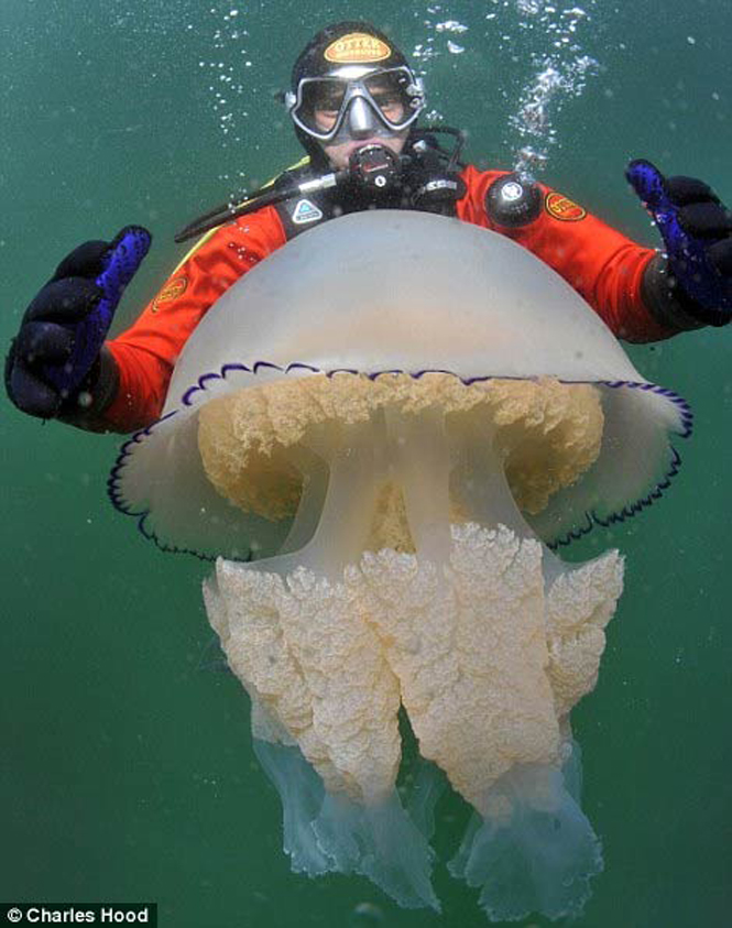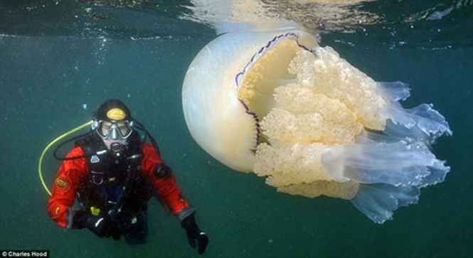 Trong chuyến lặn biển cùng cậu con trai 16 tuổi trên vùng biển Cornwall, Anh, nhiếp ảnh gia Charles Hood tình cờ gặp một đàn sứa thùng khổng lồ, trong đó có con ước tính nặng tới 35kg.