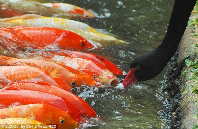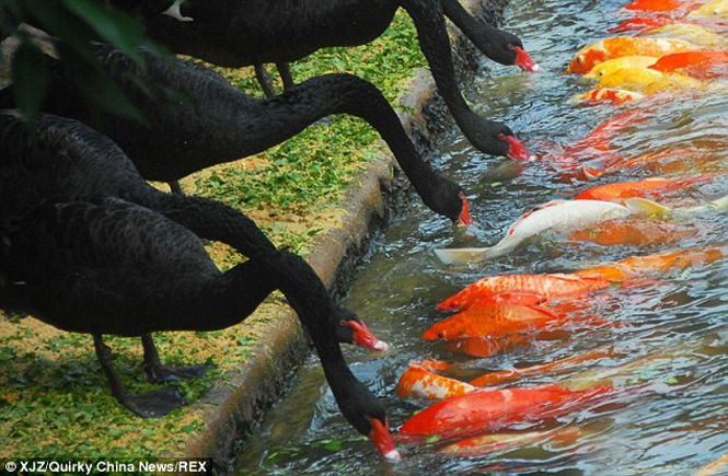 Những du khách có mặt tại công viên Safari Thâm Quyến, Quảng Đông, Trung Quốc đã cảm thấy vô cùng sửng sốt khi chứng kiến cảnh cá chép được thiên nga đen mớm cho ăn.
