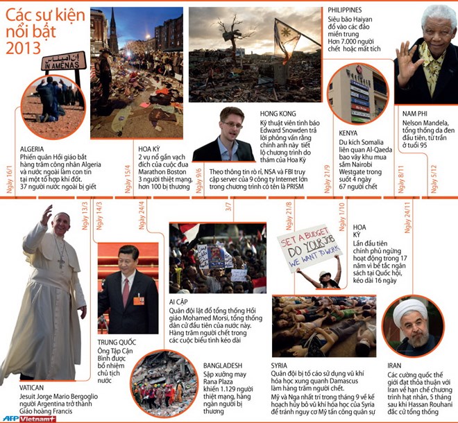 Edward Snowden tiết lộ chương trình do thám của Hoa Kỳ, siêu bão Haiyan tàn phá Philippines khiến hơn 7.000 người chết hoặc mất tích... là hai trong số những sự kiện nổi bật trong năm 2013.
