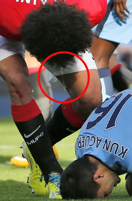 Tình huống gây tranh cãi này xảy ra trong hiệp 1. Sau khi va chạm với Fellaini, Aguero đã ngã trong vòng cấm và anh đòi được hưởng một quả 11m. Fellaini sau đó đã phản ứng bằng cách hét thẳng vào Aguero và các pha quay chậm cho thấy nước bọt từ cầu thủ người Bỉ đã rơi vào Aguero.