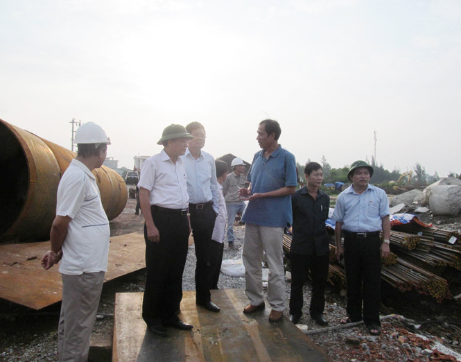 | Lãnh đạo huyện Quảng Trạch kiểm tra đập Đồng Mười (xã Quảng Đông). |