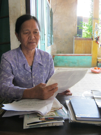 | Bà Trần Thị Thản bên những kỷ vật hiếm hoi của mình. Ảnh: D.C.H |