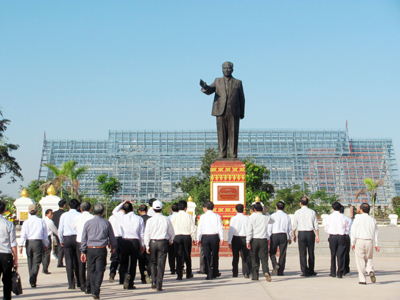 | Thợ nề Diêm Điền đắp nổi hình rồng bằng xi măng và khảm đá men trên trụ. |