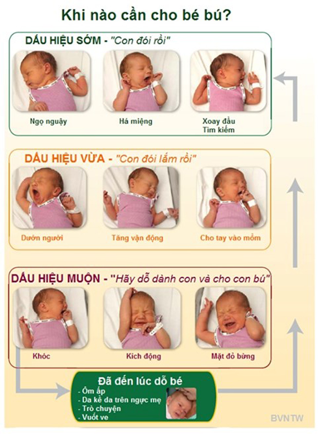 Các chuyên gia y tế khuyên mẹ cho bé sơ sinh bú theo nhu cầu, khi bé đói. Nhiều mẹ thường bắt đầu cho con bú khi thấy bé khóc. Tuy nhiên, khóc là một biểu hiện muộn của đói. Không nên chờ tới lúc này mới cho bé bú vì đói quá có thể khiến bé trở nên bực bội, khó dỗ.
