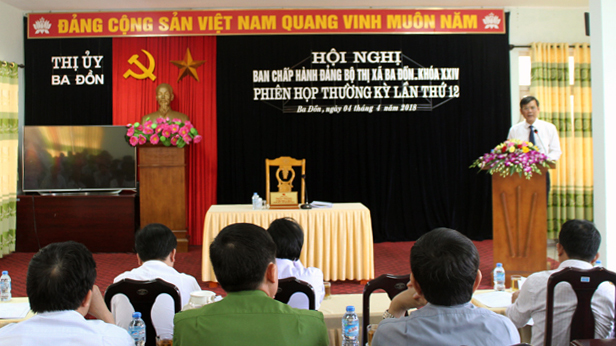 (QBĐT) - Sáng 4-4, Thị uỷ Ba Đồn tổ chức phiên họp thường kỳ lần thứ 12 (khoá XXIV), nhằm đánh giá tình hình, kết quả thực hiện nhiệm vụ kinh tế-xã hội, quốc phòng-an ninh, công tác xây dựng Đảng quý I, nhiệm vụ trọng tâm quý II năm 2018.