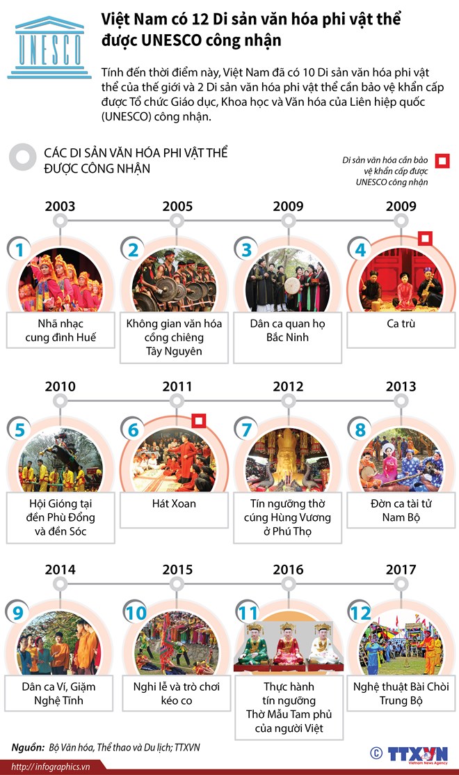 Tính đến thời điểm này, Việt Nam đã có 10 di sản văn hóa phi vật thể của thế giới và 2 di sản văn hóa phi vật thể cần bảo vệ khẩn cấp được Tổ chức Giáo dục, Khoa học và Văn hóa của Liên hiệp quốc./.
