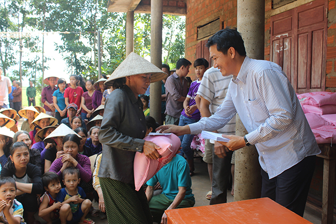 | Đồng chí Trần Quang Minh, Phó Chủ tịch Ủy ban MTTQVN tỉnh tặng quà các gia đình chính sách ở thôn Cầu Lợi 2. |