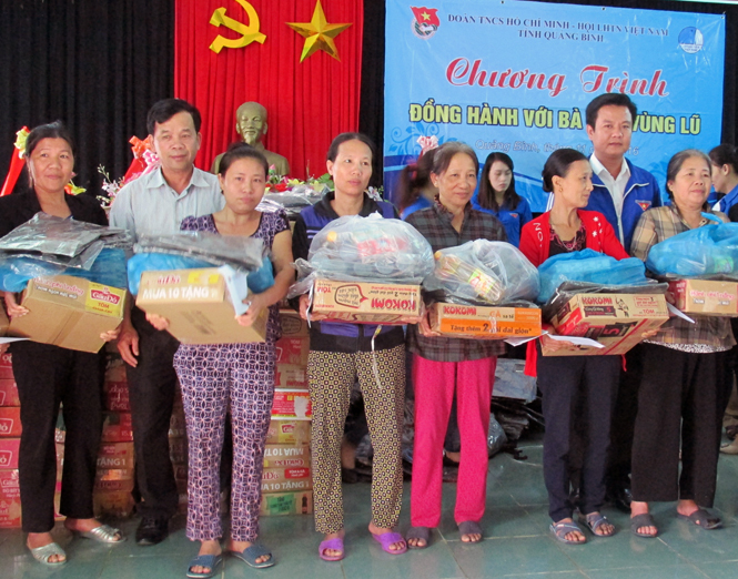 Đến với bà con nơi rốn lũ xã Quảng Tân (thị xã Ba Đồn), cùng với việc động viên, chia sẻ những thiệt hại nặng do lũ chồng lên lũ mà con nơi đây đã phải gánh chịu, đoàn đã trực tiếp trao 250 phần quà, mỗi phần trị giá hơn 1 triệu đồng. Cũng tại đây, đoàn đã có quà riêng là bánh kẹo để tặng cho các cháu thiếu niên.