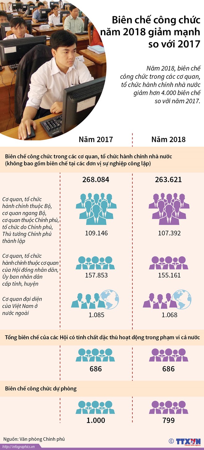 Năm 2018, biên chế công chức trong các cơ quan, tổ chức hành chính nhà nước sẽ giảm hơn 4.000 biên chế so với năm 2017.